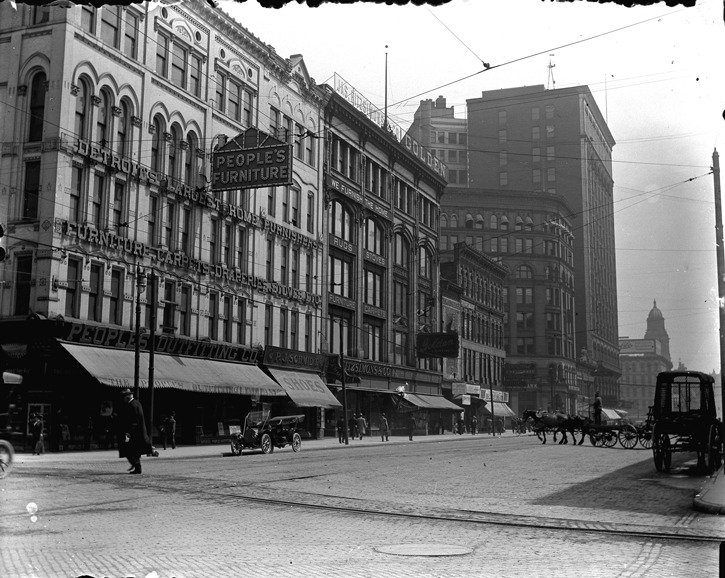 Favorite this☆ Michigan Avenue near Rowland Description: Businesses, including People's Outfitting Co., line the north side of Michigan Avenue between Rowland and Griswold. Recorded in glass negative ledger: "LD/Streets-Michigan Avenue, N. Roland to Griswold, May 12, 1910." Details Resource ID: EB02f061 Subject: Streets--Michigan--Detroit Commercial buildings--Michigan--Detroit House furnishings industry and trade--Michigan--Detroit Glass negatives Date Issued: 1910-05-12 Format: 1 negative : glass ; 4 x 5 in. Member of: Burton Historical Collection Negative Number: BHC glass neg. no. 2783 Rights: Physical rights are retained by DPL. Copyright is retained in accordance with U.S. copyright laws.