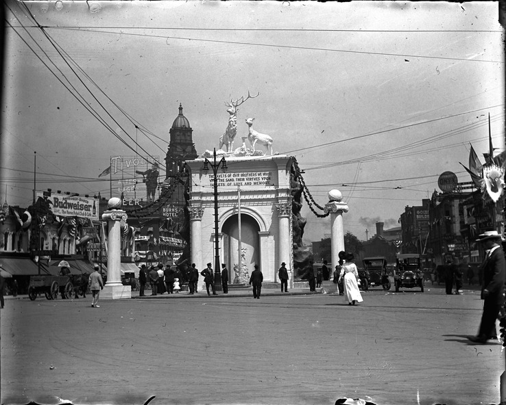 Favorite this☆ Benevolent and Protective Order of Elks arch Description: Pedestrians walk by a decorated arch with three elk on top and the words, "The faults of our brothers we write in sand, their virtues upon tablets of love and memory," carved on top. Recorded in glass negative ledger: "LD/Conventions-Elks." Details Resource ID: EB02f077 Subject: Arches--Michigan--Detroit Elk--Michigan--Detroit Elks (Fraternal order) Streets--Michigan--Detroit Glass negatives Date Issued: Unknown year Format: 1 negative : glass ; 4 x 5 in. Member of: Burton Historical Collection Negative Number: BHC glass neg. no. 2799 Rights: Physical rights are retained by DPL. Copyright is retained in accordance with U.S. copyright laws.