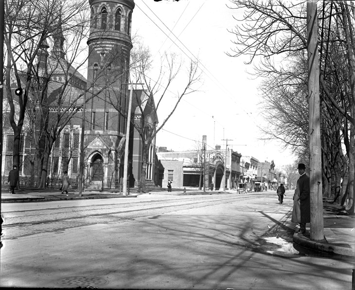 Favorite this☆ Woodward Avenue and Parsons Description: Man in an overcoat and bowler hat leans against pole on corner of Woodward Avenue and Parsons, across the street from him is a church and a row of businesses. Recorded in glass negative ledger: "LD/Streets-Woodward & Parsons." Details Resource ID: EB02f116 Subject: Woodward Avenue (Mich.) Streets--Michigan--Detroit Commercial buildings--Michigan--Detroit Church buildings--Michigan--Detroit Glass negatives Date Issued: Unknown year Format: 1 negative : glass ; 4 x 5 in. Member of: Burton Historical Collection Negative Number: BHC glass neg. no. 2838 Rights: Physical rights are retained by DPL. Copyright is retained in accordance with U.S. copyright laws.