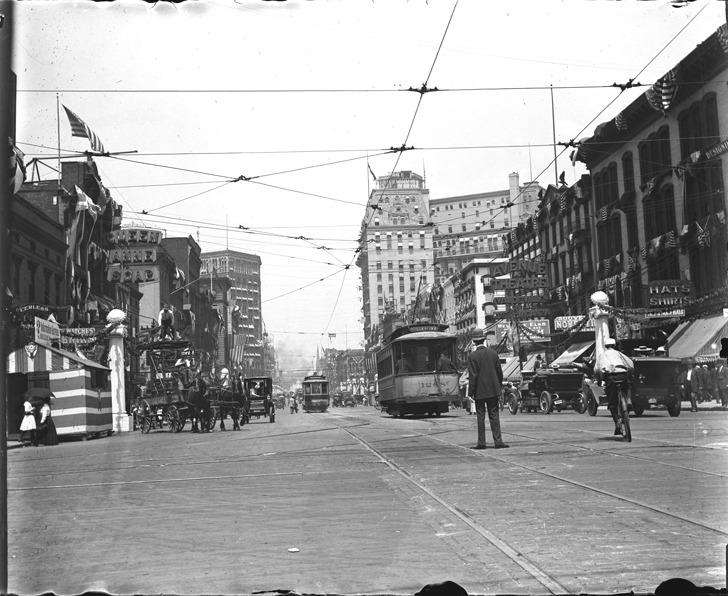 Favorite this☆ Woodward Avenue at Jefferson Avenue Description: Businesses, including the Avenue Theatre, on both sides of Woodward Avenue decorated with patriotic bunting. Recorded in glass negative ledger: "LD/Streets-Woodward & Jefferson." Emulsion damage to bottom of glass negative. Details Resource ID: EB02f123 Subject: Woodward Avenue (Mich.) Streets--Michigan--Detroit Commercial buildings--Michigan--Detroit Music-halls (Variety-theaters, cabarets, etc.)--Michigan--Detroit Glass negatives Date Issued: Unknown year Format: 1 negative : glass ; 4 x 5 in. Member of: Burton Historical Collection Negative Number: BHC glass neg. no. 2845 Rights: Physical rights are retained by DPL. Copyright is retained in accordance with U.S. copyright laws.