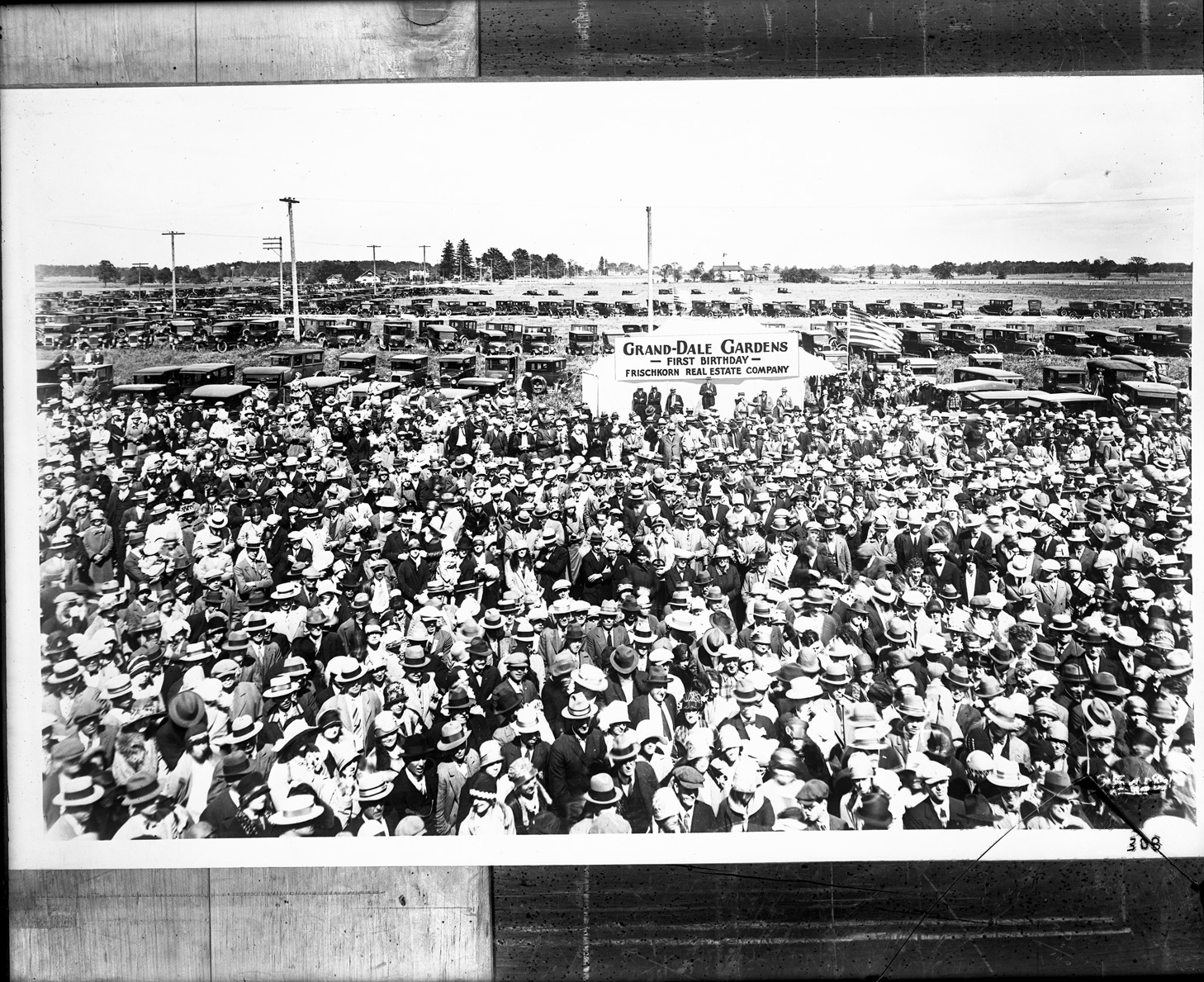 Large crowd of people poses for camera with sign behind them reading, "Grand-Dale Gardens, first birthday, Frischkorn Real Estate Company," with cars in background. Recorded in glass negative ledger: "D/Real estate-Frischkorn real estate co." Glass negative is cracked.