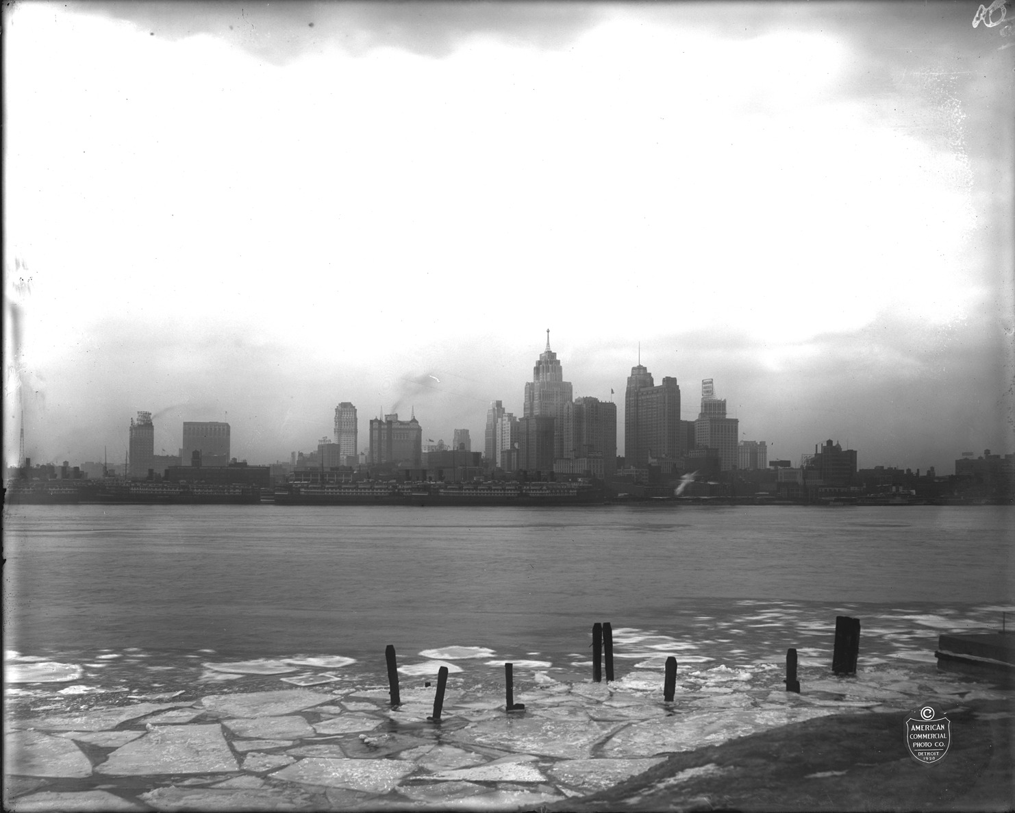 View of the Detroit riverfront as seen from Windsor, Ontario, with large chunks of ice in water in foreground. Recorded in glass negative ledger: "D/Riverfront."