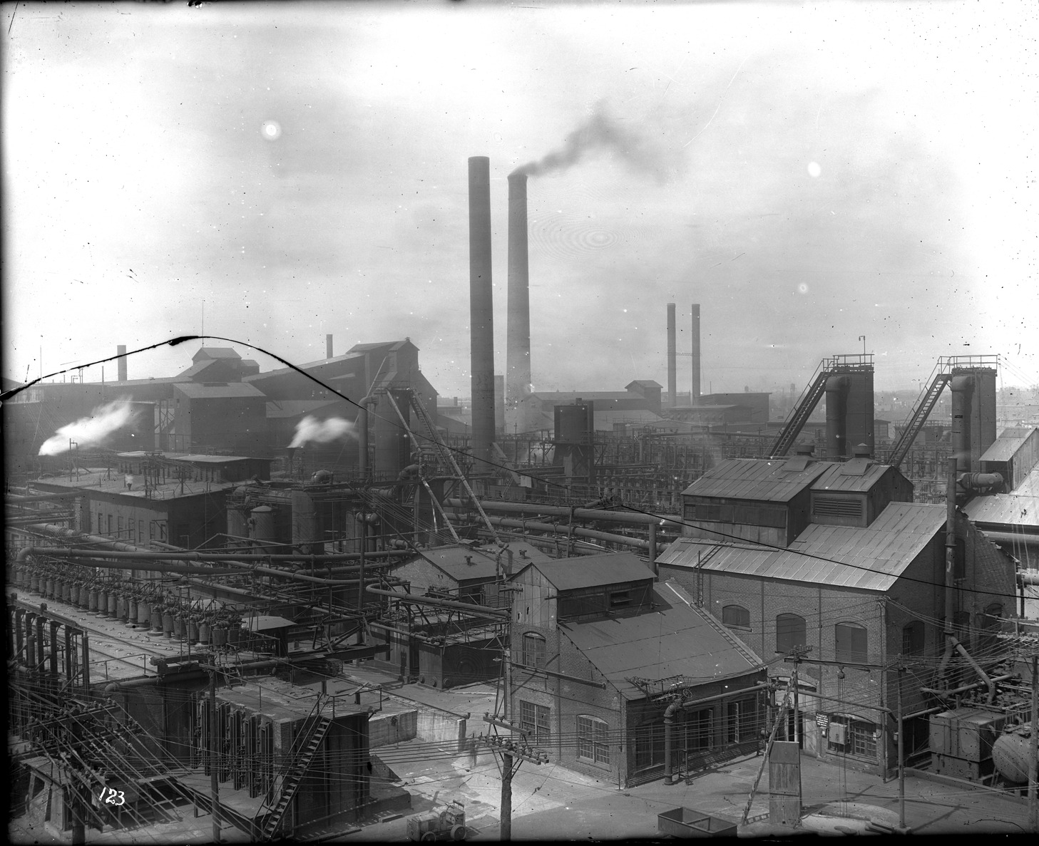 Favorite this☆ Factories and smokestacks Description: Factories and smokestacks in unidentified area of Detroit. Recorded in glass negative ledger: "D/Industries & business houses." Glass negative is cracked. Details Resource ID: EB02f158 Subject: Factories--Michigan--Detroit Industrial chimneys--Michigan--Detroit Glass negatives Date Issued: Unknown year Format: 1 negative : glass ; 8 x 9.75 in. Member of: Burton Historical Collection Negative Number: BHC glass neg. no. 2885 Rights: Physical rights are retained by DPL. Copyright is retained in accordance with U.S. copyright laws.