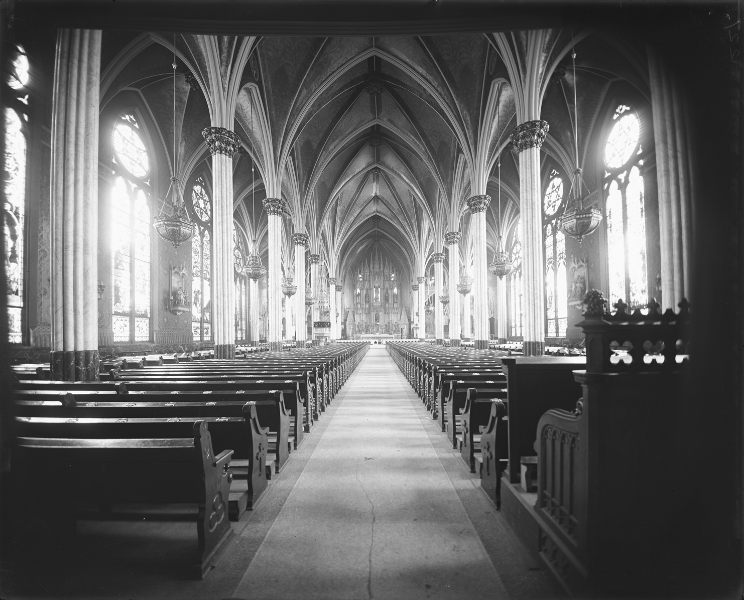Interior view of pews and vaulted ceiling of the Sweetest Heart of Mary Church on Russell at Canfield, designed by Spier and Rohns, built in 1893. Recorded in glass negative ledger: "D/Churches-R.C.-Sweetest Heart of Mary."