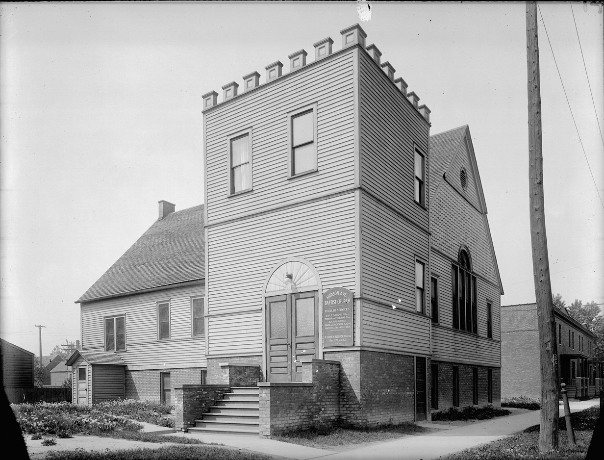 Favorite this☆ Hudson Avenue Baptist Church Description: View of the Hudson Avenue Baptist Church at the southwest corner of Hudson and Maybury Grand Avenues. Recorded in glass negative ledger: "D/Churches-Baptist-Hudson Avenue." Details Resource ID: EB02f213 Subject: Baptist church buildings--Michigan--Detroit Glass negatives Date Issued: Unknown year Format: 1 negative : glass ; 6.25 x 8.25 in. Member of: Burton Historical Collection Negative Number: BHC glass neg. no. 2944 Rights: Physical rights are retained by DPL. Copyright is retained in accordance with U.S. copyright laws.