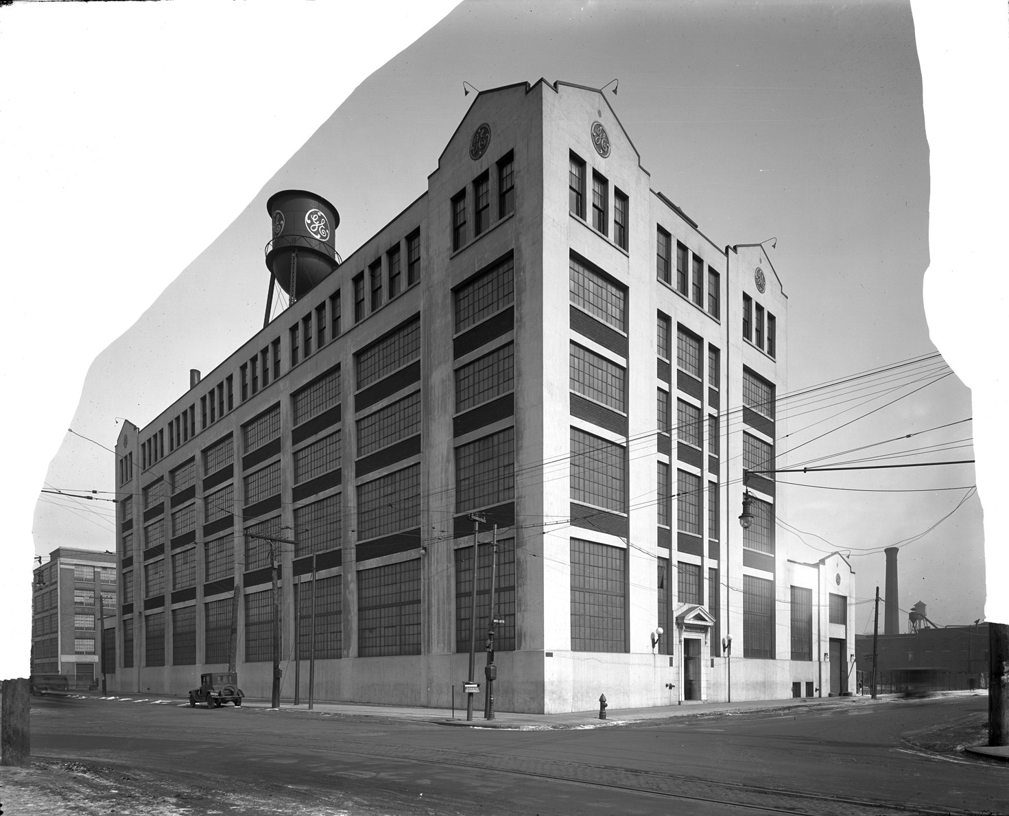 Favorite this☆ General Electric Co. on Third and Antoinette Description: General Electric Company on the corner of Third and Antoinette. Recorded in glass negative ledger: "D/Industries & business houses-General electric co." Paint on glass negative masks part of the image. Details Resource ID: EB02f226 Subject: General Electric Company--Buildings Streets--Michigan--Detroit Glass negatives Date Issued: Unknown year Format: 1 negative : glass ; 8 x 9.75 in. Member of: Burton Historical Collection Negative Number: BHC glass neg. no. 2961 Rights: Physical rights are retained by DPL. Copyright is retained in accordance with U.S. copyright laws.