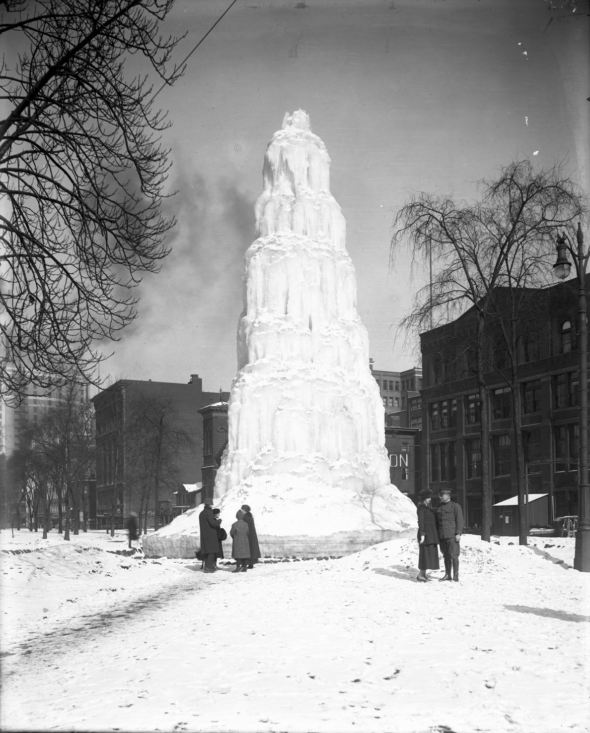 People stand in front of a large, multi-tiered ice sculpture formed by a frozen fountain on Washington Boulevard. Recorded in glass negative ledger: "D/Fountains-Ice fountain."