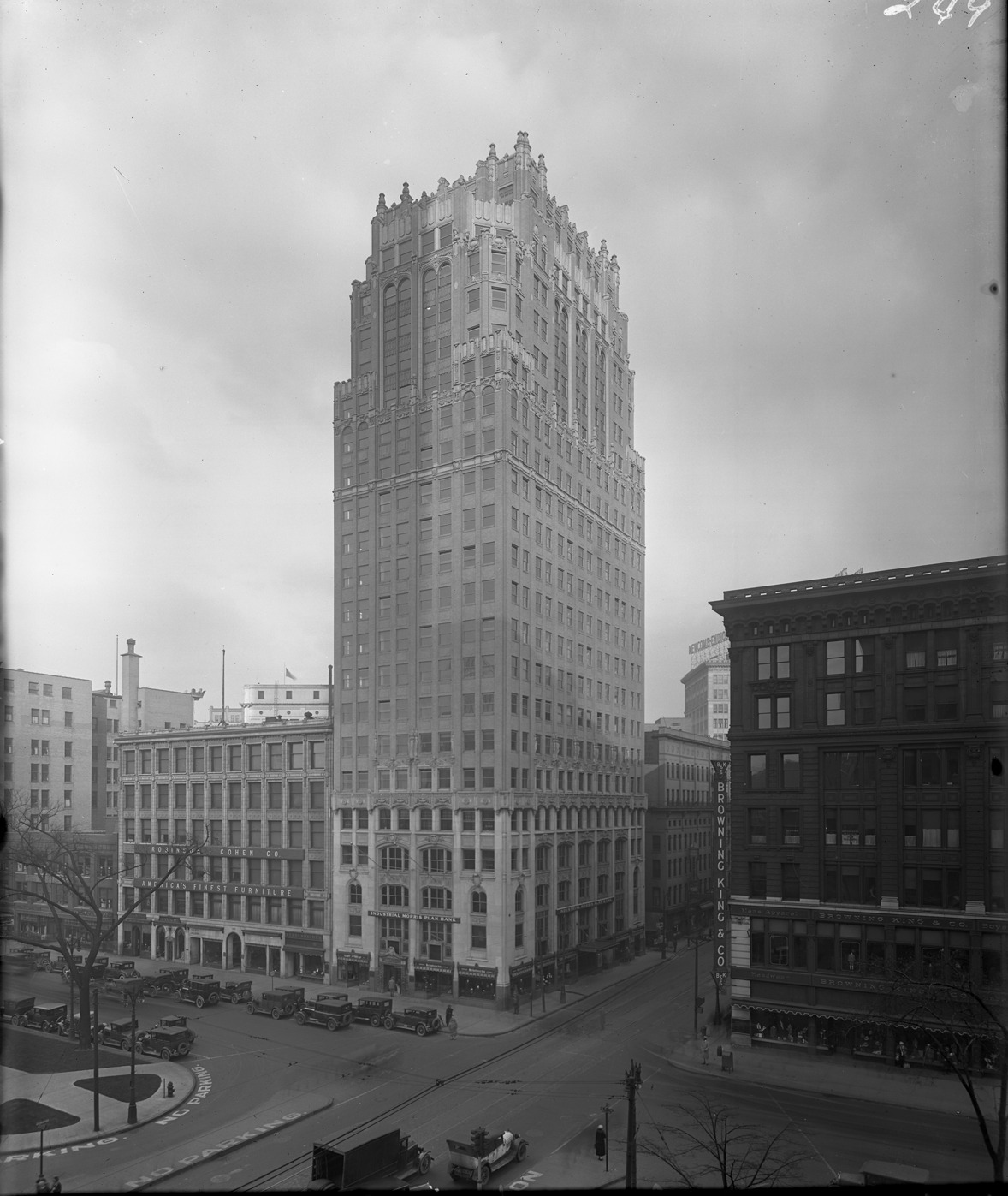 View of Washington Boulevard with a number of businesses including Industrial Morris Plan Bank and Robinson, Cohen Co., with automobiles parked on street. Recorded in glass negative ledger: "D/Streets-Washington."
