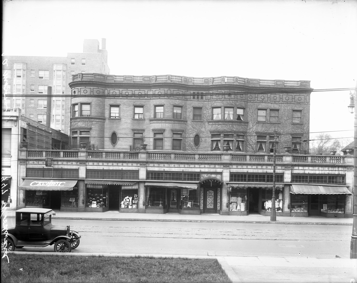 LaFrance Apartments on Woodward Ave., retail stores in front include 3449 Mrs. H. McHugh Fashion Shop at 3449 Woodward. Recorded in glass negative ledger: "D/Streets-Woodward."