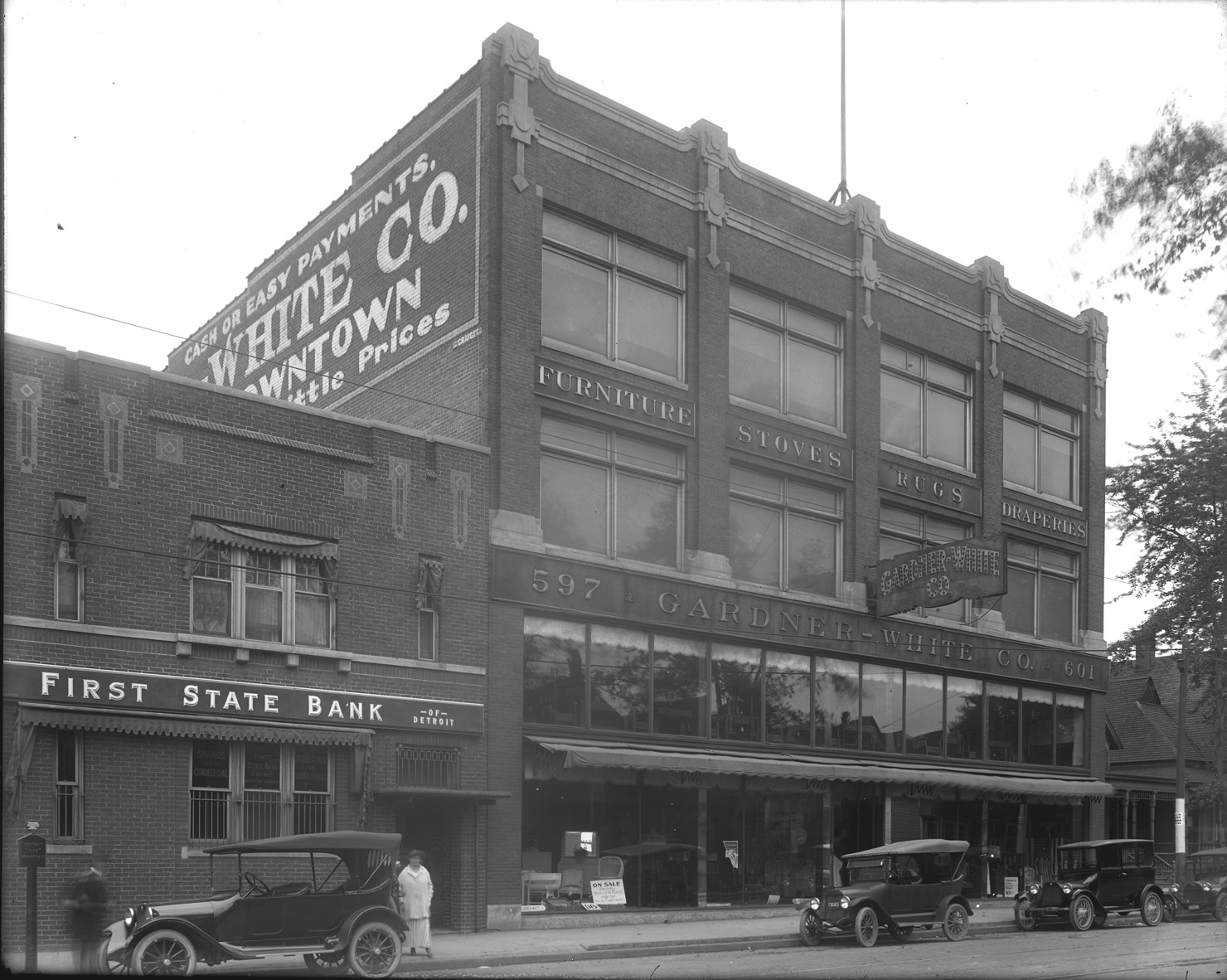 Favorite this☆ Gardner White Co. furniture and First State Bank Description: Gardner White Co. furniture next to First State Bank, cars parked on street. Recorded in glass negative ledger: "D/Industries & business houses-Gardner-White." Details Resource ID: EB02f264 Subject: Furniture industry and trade--Michigan--Detroit Bank buildings--Michigan--Detroit Glass negatives Date Issued: Unknown year Format: 1 negative : glass ; 8 x 10 in. Member of: Burton Historical Collection Negative Number: BHC glass neg. no. 3012 Rights: Physical rights are retained by DPL. Copyright is retained in accordance with U.S. copyright laws.