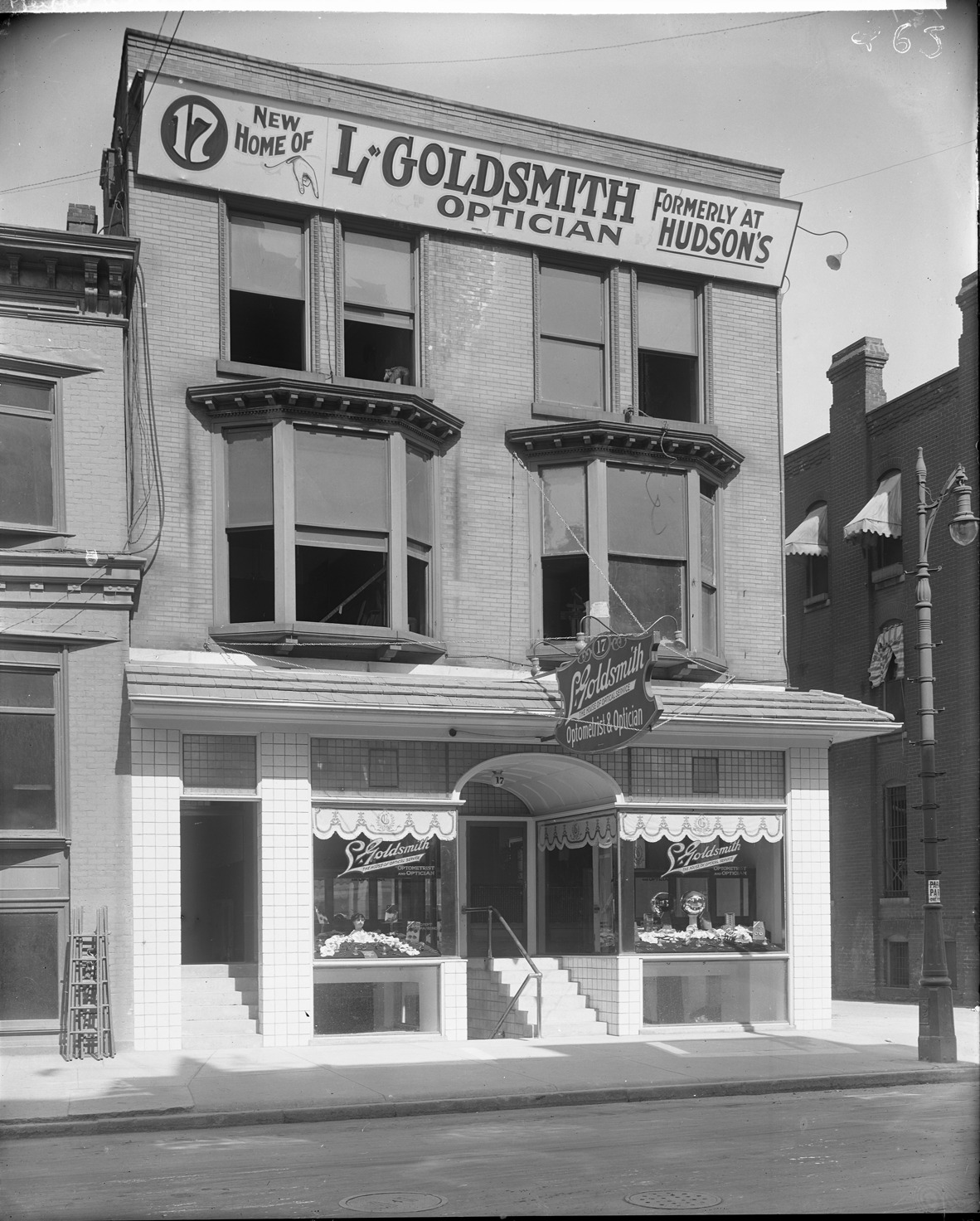 Favorite this☆ Business of optician Leon Goldsmith Description: Storefront for L. Goldsmith, optician, sign on front says "Formerly at Hudson's." Recorded in glass negative ledger: "D/Industries & business houses-Goldsmith, Leon." Details Resource ID: EB02f267 Subject: Opticians--Michigan--Detroit Glass negatives Date Issued: Unknown year Format: 1 negative : glass ; 10 x 8 in. Member of: Burton Historical Collection Negative Number: BHC glass neg. no. 3015 Rights: Physical rights are retained by DPL. Copyright is retained in accordance with U.S. copyright laws.