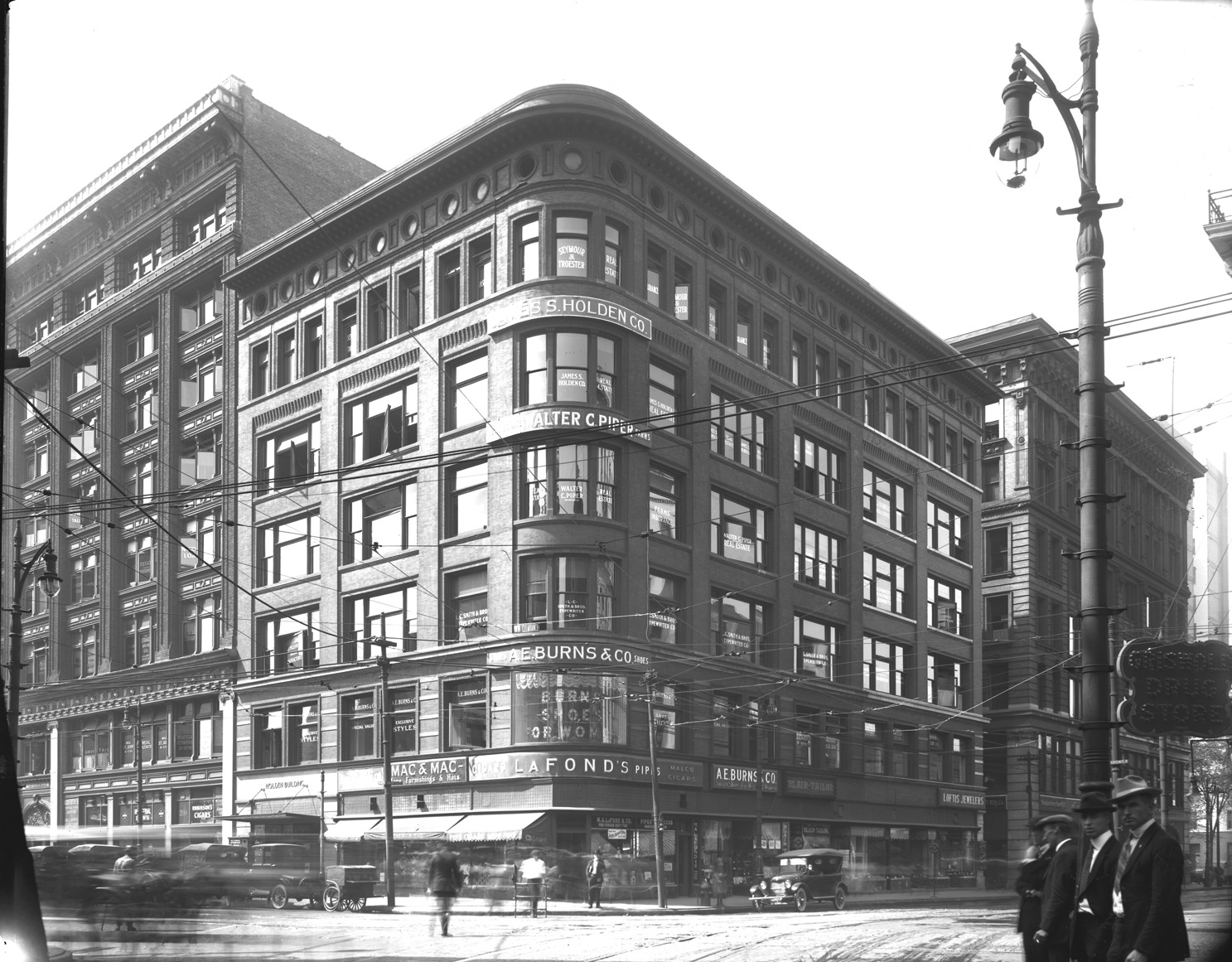 Bamlett Building on Griswold and Grand River Ave. with A.E. Burns & Co. Shoe business, James S. Holden real estate and LaFond's Pipes, among other businesses. Two men dressed in suits and hats stand on street corner under an electric Griswold Drug Store sign looking at camera. Recorded in glass negative ledger: "D/Buildings-Holden."