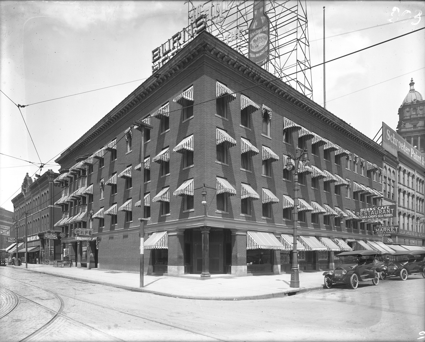 Favorite this☆ Burns Hotel and Cafe on Cadillac Square Description: Four-story Burns Hotel with striped awnings on all windows and Burns' Cafe Restaurant on Cadillac Square. Recorded in glass negative ledger: "D/Hotels-Burns." Details Resource ID: EB02f294 Subject: Hotels--Michigan--Detroit Restaurants--Michigan--Detroit Glass negatives Date Issued: Unknown year Format: 1 negative : glass ; 8 x 10 in. Member of: Burton Historical Collection Negative Number: BHC glass neg. no. 3042 Rights: Physical rights are retained by DPL. Copyright is retained in accordance with U.S. copyright laws.