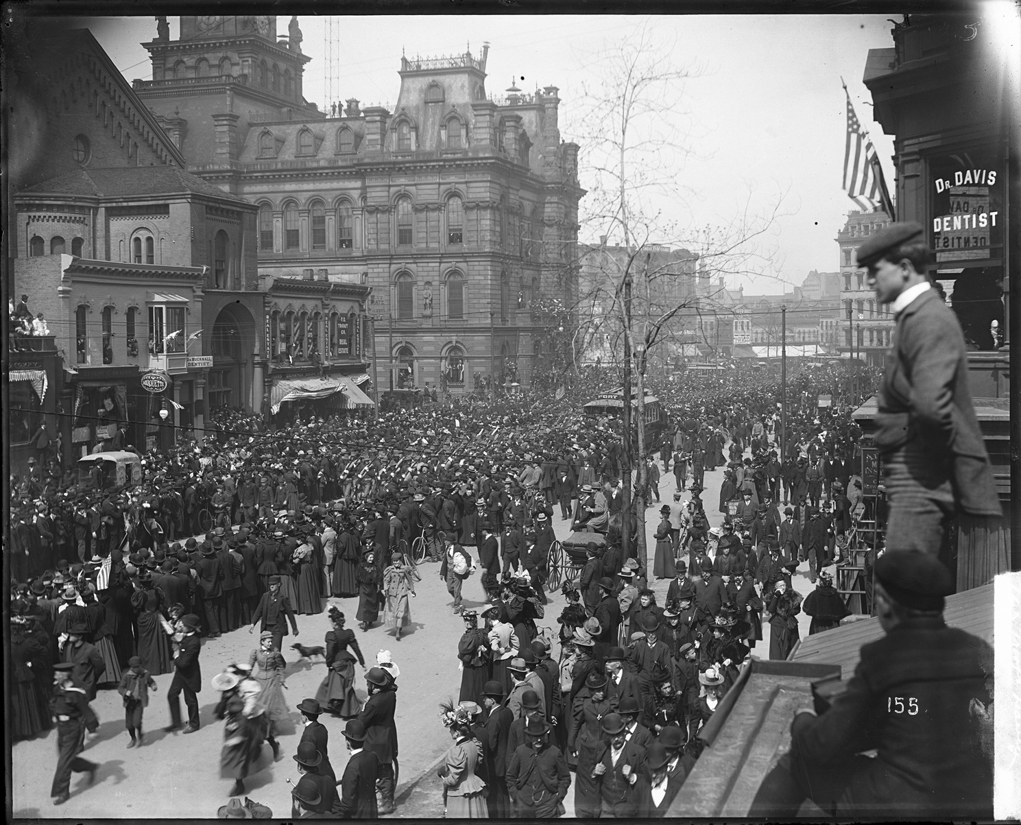 Spectators line street watching soldiers march with rifles; others in windows and on ledges. Signs include: Eugene E. Draper; Marquette; Dr. Bucknall, dentist; Exchange Cigar Co.; F.B. Trout Co., real estate; McWilliams & Moore, grocers; Afer Bros.; Cut Rate Tea; Dr. Davis, dentist. Written on negative: "155." Recorded in glass negative ledger: "D/Parades."