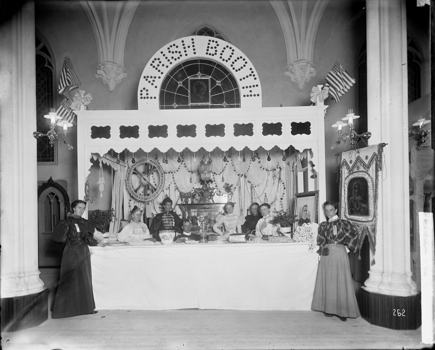 Favorite this☆ Most Holy Redeemer parish booth Description: Women with priest at fund-raising booth in side aisle of the church. Sign reads "Parish booth." Written on negative: "262." Flaw in negative in lower left corner. Recorded in glass negative ledger: "D/Churches-Holy Redeemer." Details Resource ID: EB02f311 Subject: Bazaars (Charities)--Michigan--Detroit Catholic church buildings--Michigan--Detroit Glass negatives Date Issued: Unknown year Format: 1 negative : glass ; 8 x 10 in. Member of: Burton Historical Collection Negative Number: BHC glass neg. no. 3069 Rights: Physical rights are retained by DPL. Copyright is retained in accordance with U.S. copyright laws.