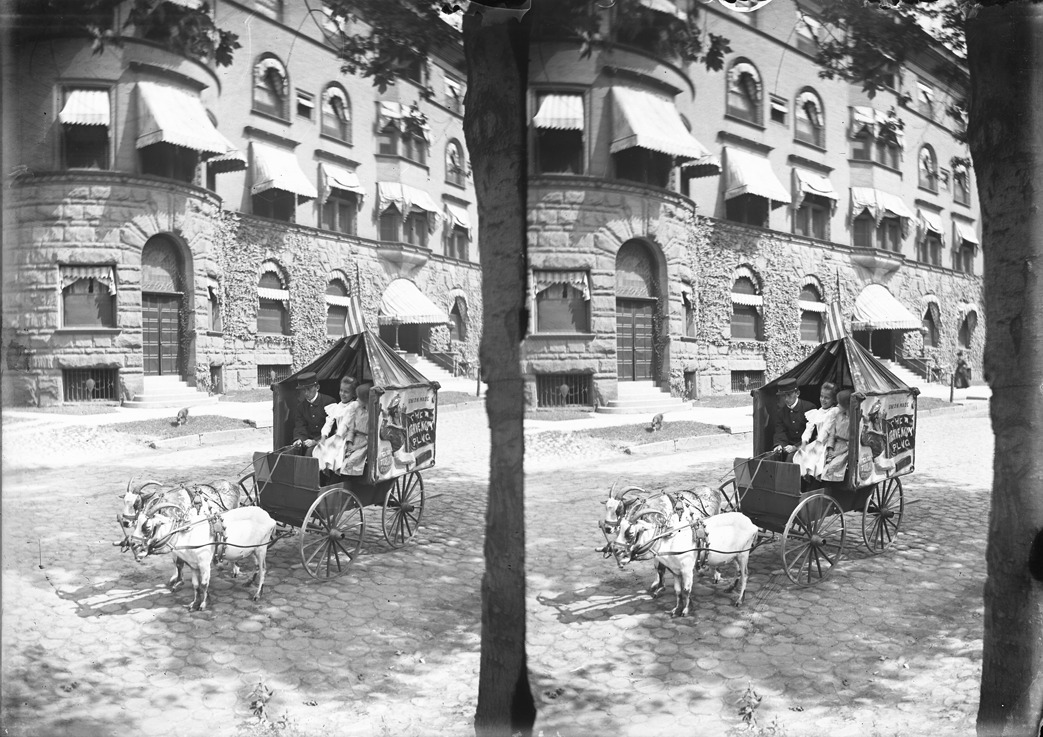 Stereo negative. Boy in uniform drives cart pulled by two goats; two girls on seat with him. On cobbled street in front of stone and brick building, with rounded windows and doorways. Poster on cart side, with picture of sailor, advertising Navy brand tobacco: "Union made. Chew / serve Navy / plug. Globe Tobacco Company." Ledger reads: "D/Children."