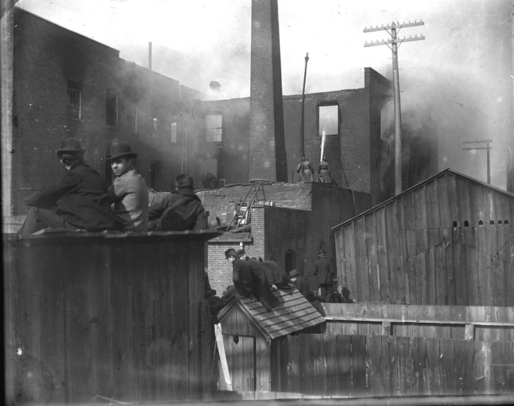 Spectators sitting on rooftops and looking over fences as firemen spray water into upper window of brick building. Recorded in glass negative ledger: "D/Fires." Some scratches and minor damage to emulsion.