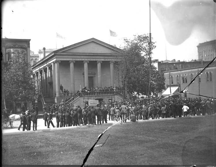Crowd watches demonstration of water stream from long extension on fire engine (stream not visible in this photograph). In front of Philharmonic Hall on Lafayette. Signs include: G. Guth & Son, groceries, choice meat. Recorded in glass negative ledger: "D/Buildings-Philharmonic Hall." Negative cracked; has water damage; emulsion flaking.