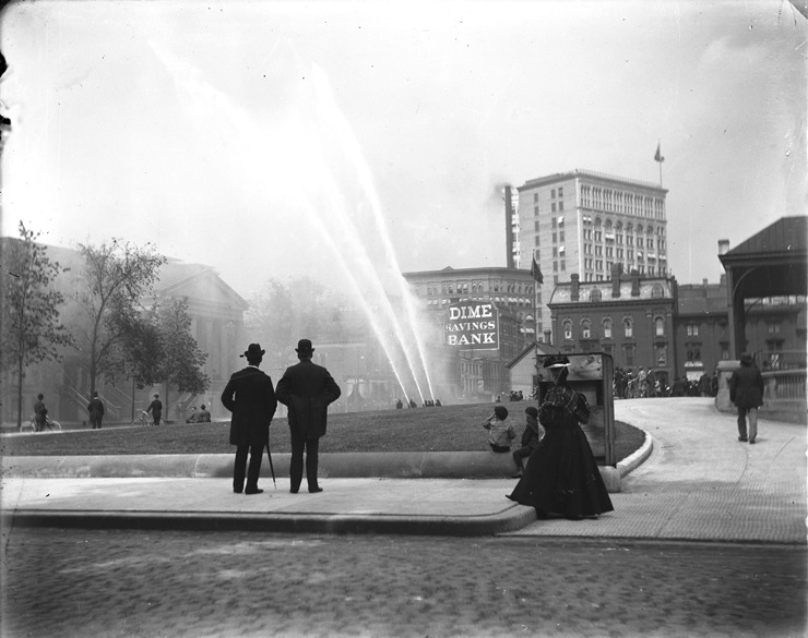 Crowd in park watches demonstration of water streaming from hoses held by firemen. In front of Philharmonic Hall on Lafayette. Sign visible: Dime Savings Bank. Recorded in glass negative ledger: "D/Fire dept.-Equipment."