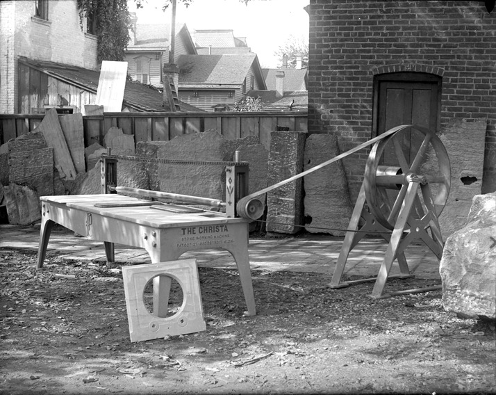Machine for cutting stone, with large flywheel, set up in dirt yard next to brick building. Slabs of stone lean against wall and board fence. Written on machine table: "The Christa stone working machine, pat. Oct. 27, 1885, Detroit, Mich." Recorded in glass negative ledger: "D/The Christa stone working machine."