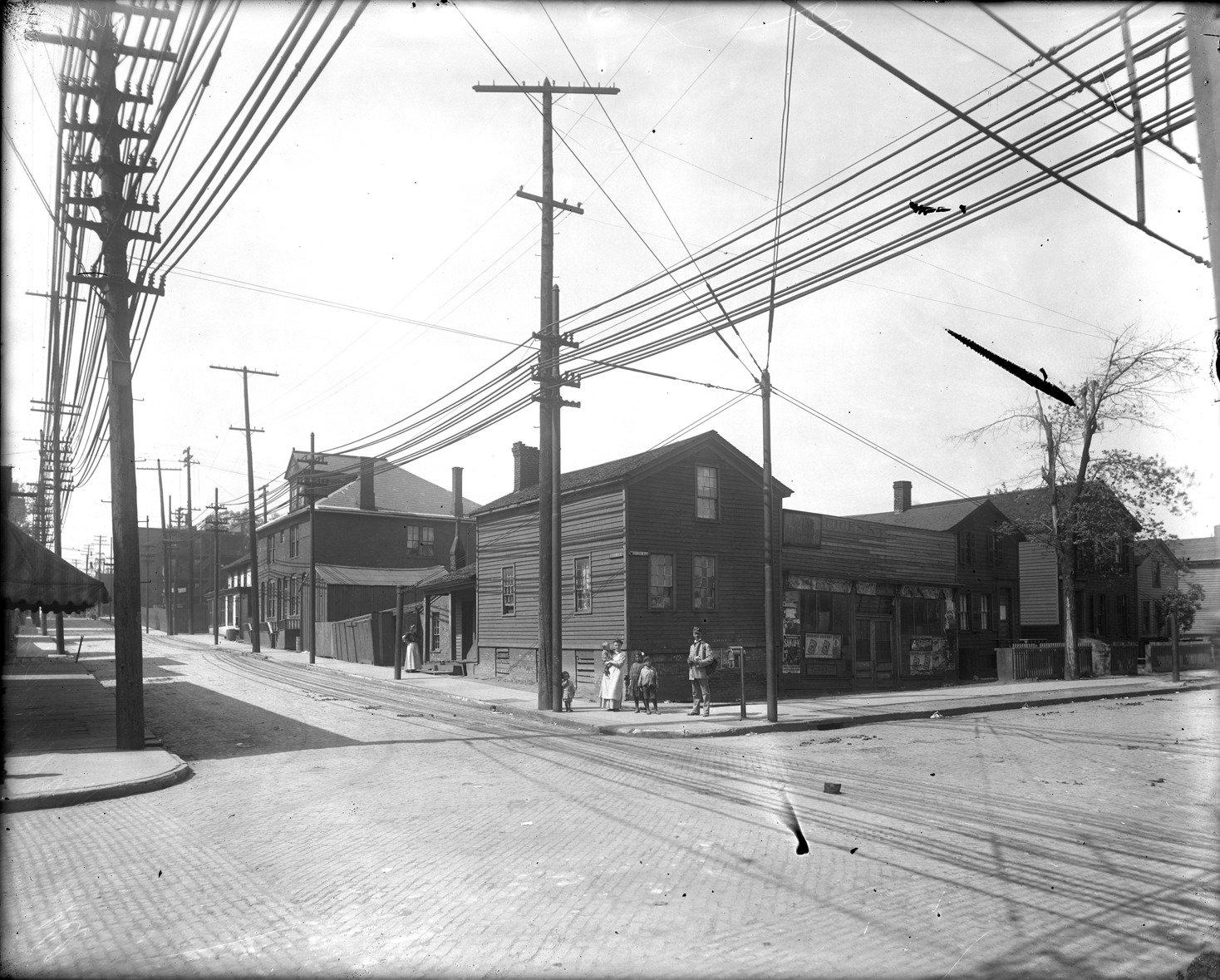 Woman, man, and children on street corner in front of clapboard building with street signs; only sign for Franklin St. legible. Viewed from across brick-paved intersection. Another woman by doorway farther up the street. Utility lines prominent. Recorded in glass negative ledger: "D/Streets-Franklin St."