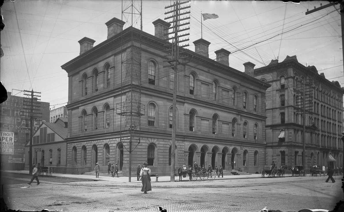 Stone post office building, viewed at an angle across intersection. Arched windows and doorways, multiple chimneys. Horse-drawn vehicles and pedestrians. Recorded in glass negative ledger: "D/Buildings-Federal-Post office (1860)." Emulsion flaking at edges and corners.
