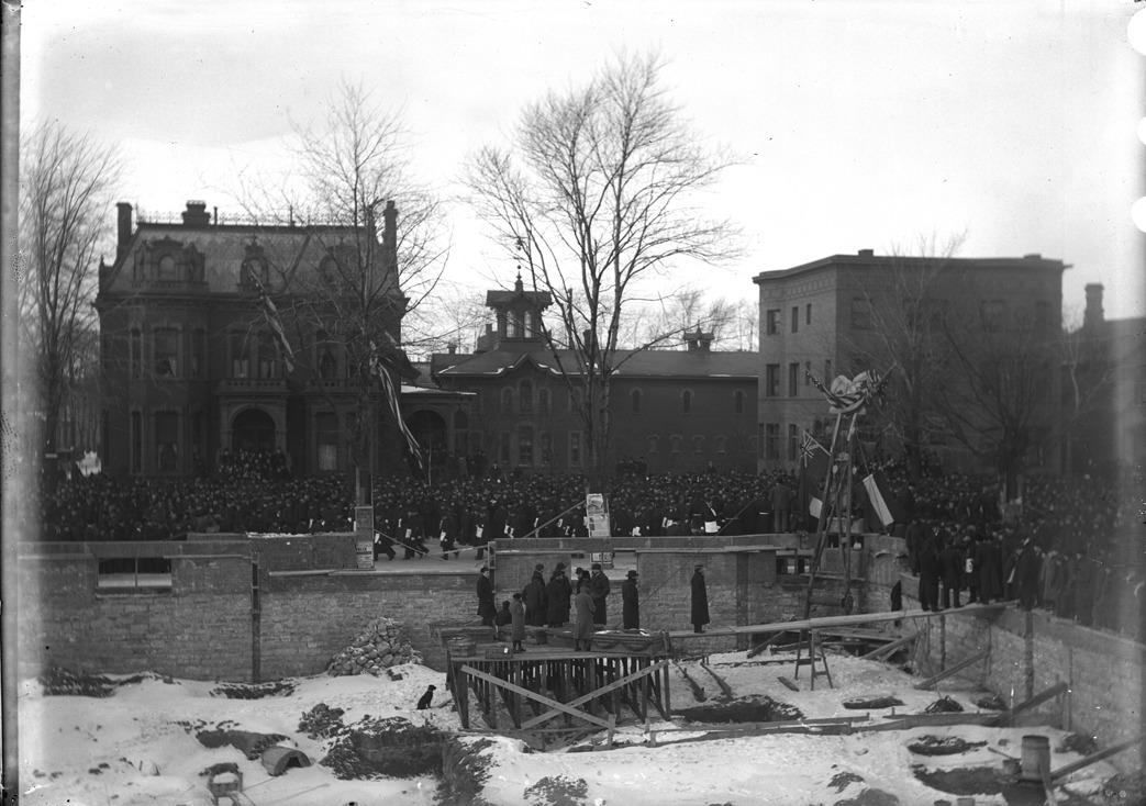 Crowd and dignitaries at post office foundation dedication. Fort and Shelby. Flags include U.S. and Canada, others cannot be distinguished. Masons in front ranks of crowd (wearing aprons over coats). Recorded in glass negative ledger: "D/Buildings-Federal-Post office (1897)." Marks and light bleeds on edges.