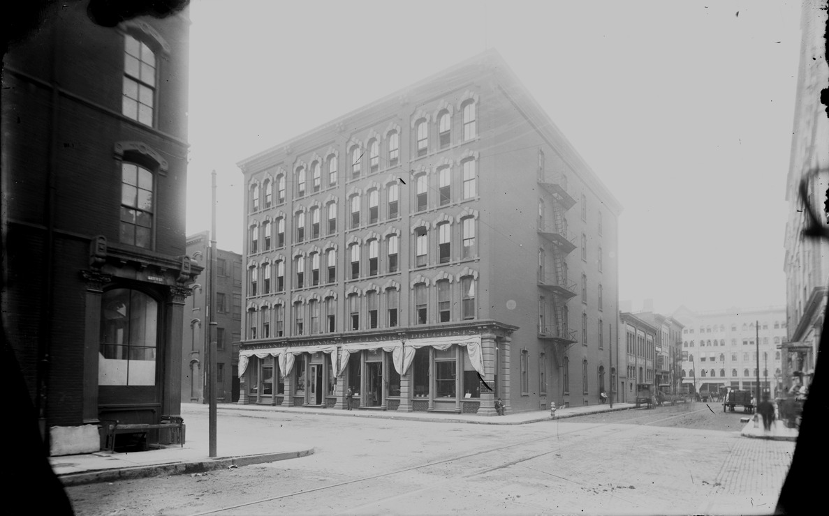 Five-story brick building viewed diagonally across intersection. Folded awnings at display windows, fire escape on side. Horse-drawn vehicles on side street. Sign reads "Farrand, Williams & Clark, druggists." Recorded in glass negative ledger: "D/Industries & business houses-Farrand, Williams & Clark." Emulsion damaged on both sides.