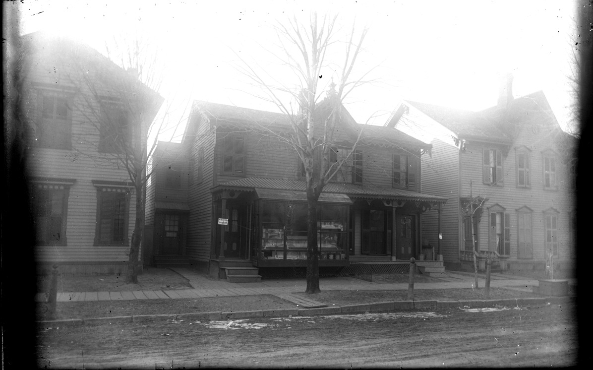 View from unpaved road of three clapboard houses close together. Central house has two front entrances, one half has display window built out from the wall, and both have notices advertising rooms to rent; there is another entrance set back from the front. Hitching post and mounting block. All three houses have architectural trim. Recorded in glass negative ledger: "D/Streets." Light bleeds; emulsion separating at sides.
