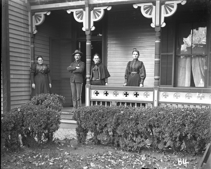 Three women standing on porch with man in uniform. House is clapboard; porch has sunburst detailing and cut-outs on balustrade supports, and is painted in two colors to emphasize detail. Written on negative: "64." Recorded in glass negative ledger: "D/History-Spanish American War." Emulsion flaking on bottom edge; some minor scattered damage.