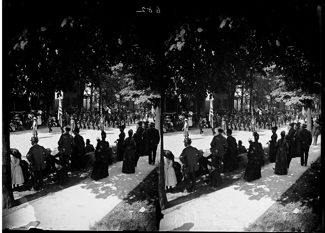Stereo negative. Spectators line both sides of residential street watching Civil War veterans march past in parade. Group of men in uniform led by man carrying striped flag and young woman in costume with plumed hat and baton. Recorded in glass negative ledger: "D/Conventions-G.A.R.-25th nat'l. encampment, Detroit, 1891." Emulsion damage on edges and corners.