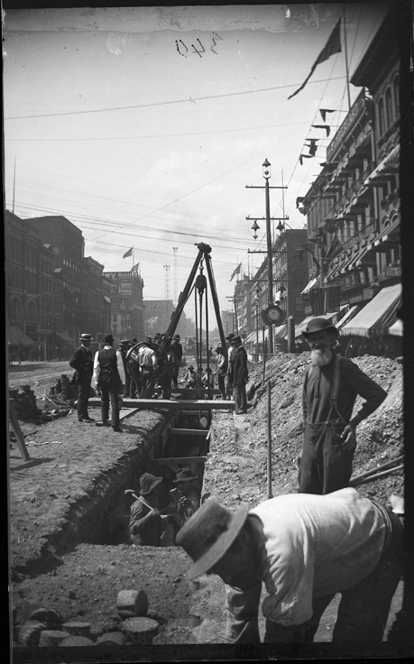View along curb-side ditch with workmen digging and others using crane to move large pipe. Several partial signs on commercial buildings; the only clear one is for "J.L. Hudson, clothier." Recorded in glass negative ledger: "D/Water supply." Tape marks along top and bottom edges.