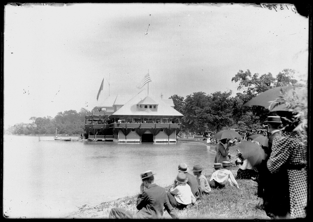 View of boathouse near shore of Belle Isle; wooden-frame building with shingled roof, veranda and dormer windows; men and women gather on banks near water; some hold parasols. Recorded in glass negative ledger: "D/Organizations-Michigan yacht club."