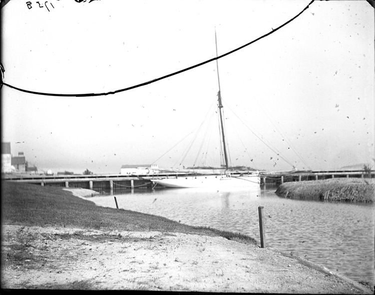 Sailboat tied up at dock with buildings beyond. Sandy bank in foreground, with stakes near water's edge. Ledger reads: "D/Parks-Waterworks. Schooner [sloop] at dock." Image rounded at top corners. Negative broken; slight emulsion damage at top edge.