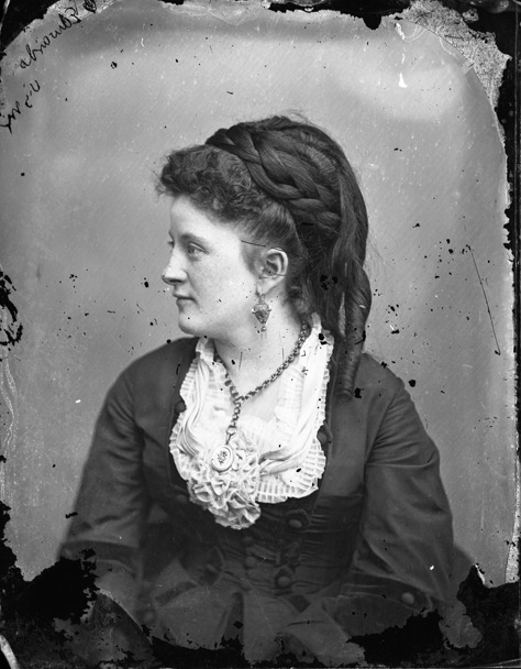 Woman posed in fashionable day dress trimmed with velvet and self-fabric buttons and wearing heavy y-shaped chain with oval pendant with flower design and shield-shaped earrings. Written on image in reverse: "Edwards." Recorded in glass negative ledger: "D/Costume-Women, Mrs. Edwards." Emulsion flaking throughout picture, especially on the edges.