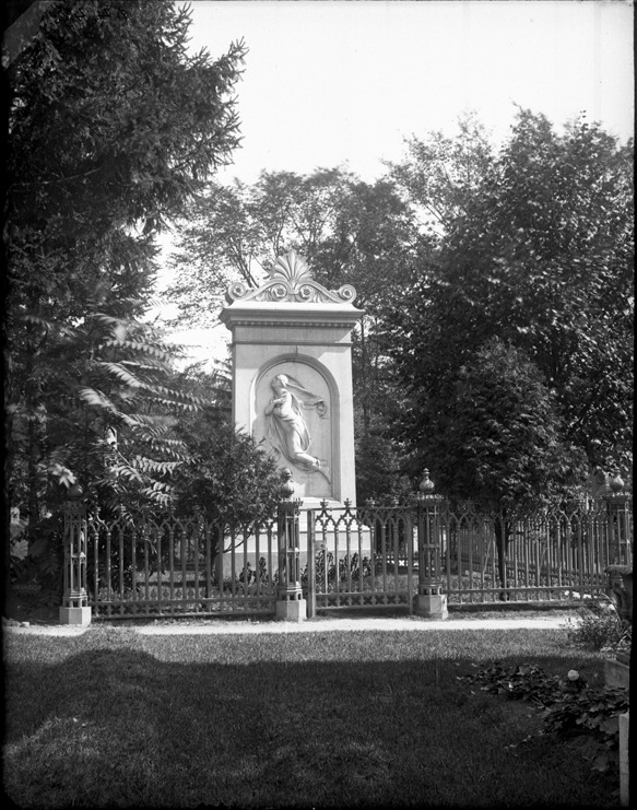 Monument with bas-relief carving of a woman, called the "Veiled Lady" monument in Elmwood Endures. Behind ornamental metal fence and set among trees. Recorded in glass negative ledger: "D/Cemeteries-Elmwood." Emulsion lifting at top left corner.