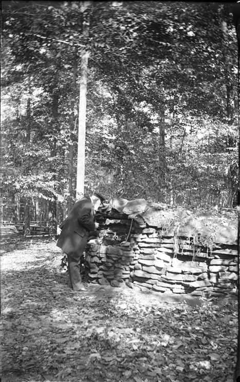 Older man with white beard looks into basin of stone fountain or sink in stone wall. Tap above basin, and dipper chained to wall. Picnic tables in the trees behind. Recorded in glass negative ledger: "D/Parks-Palmer." Emulsion flaking slightly at edges and corners.