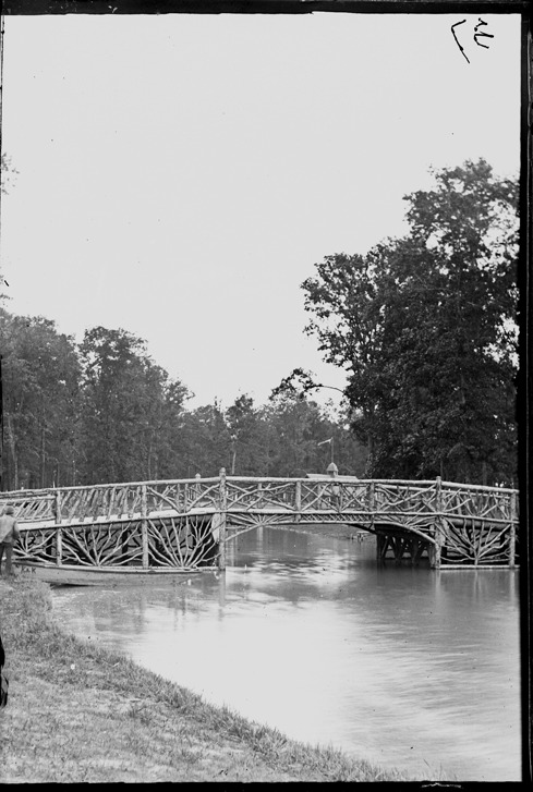 Favorite this☆ Ornate log bridge in Belle Isle Park Description: View from bank along canal past bridge made of rough logs. Building with cupola beyond. Man standing by skiff at one side of bridge. Recorded in glass negative ledger: "D/Parks-Belle Isle-Bridges." Emulsion lifting in small spot; small flakes. Details Resource ID: EB02f550 Subject: Belle Isle Park (Detroit, Mich.) Wooden bridges--Michigan--Detroit Canals--Michigan--Detroit Glass negatives Date Issued: Unknown year Format: 1 negative : glass ; 5 x 3.25 in. Member of: Burton Historical Collection Negative Number: BHC glass neg. no. 3458 Rights: Physical rights are retained by DPL. Copyright is retained in accordance with U.S. copyright laws.
