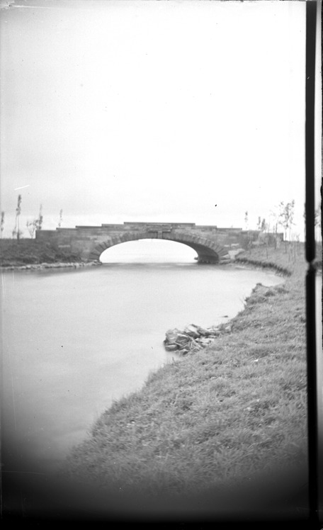 View along canal to arched stone or concrete bridge with mist beyond. Parapet of bridge is stepped. Recorded in glass negative ledger: "D/Parks-Belle Isle-Bridges, Oct. 1898." Image curved on bottom edge. Dark line down right edge. Emulsion flaking at top left corner.