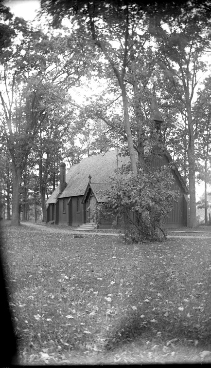 Batten-and-board church with bell tower and stained glass window, set among trees. Recorded in glass negative ledger: "D/River-Islands-Grosse Ile."