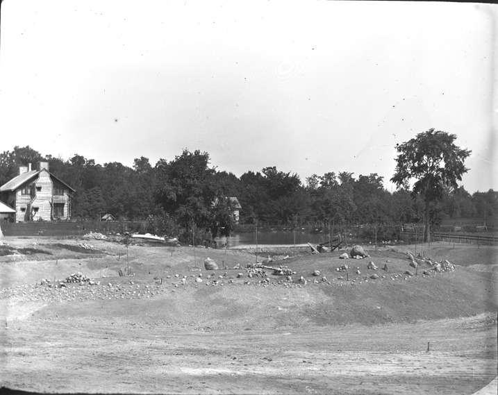 View of Palmer log cabin from neighboring hill, across a stretch of bare ground and stones. Looks like pond being extended around peninsula. Other buildings visible beyond pond. Recorded in glass negative ledger: "D/Parks-Palmer." Emulsion flaking on corner. Minor scratches and splotches on image.