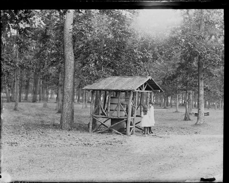 Girls standing at entrance to bark-roofed rustic structure, with blurred figure next to drinking water tank mounted on log segment. Recorded in glass negative ledger: "D/Parks-Belle Isle-Buildings." Emulsion flaking at edges.
