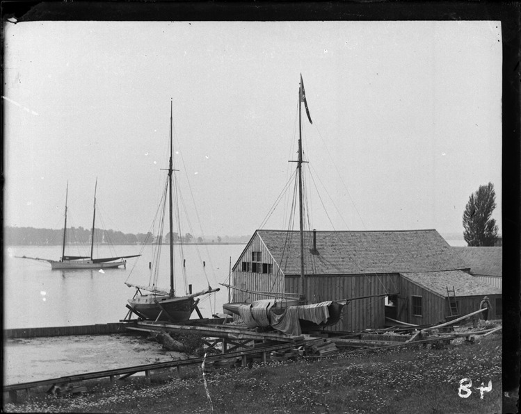 Two single-masted sailboats on boat ramp leading into Detroit River, next to batten-and-board boathouse. Double-masted sailboat moored off shore. Recorded in glass negative ledger: "D/Parks-Belle Isle-Buildings." Emulsion flaking at edges; some scratches.