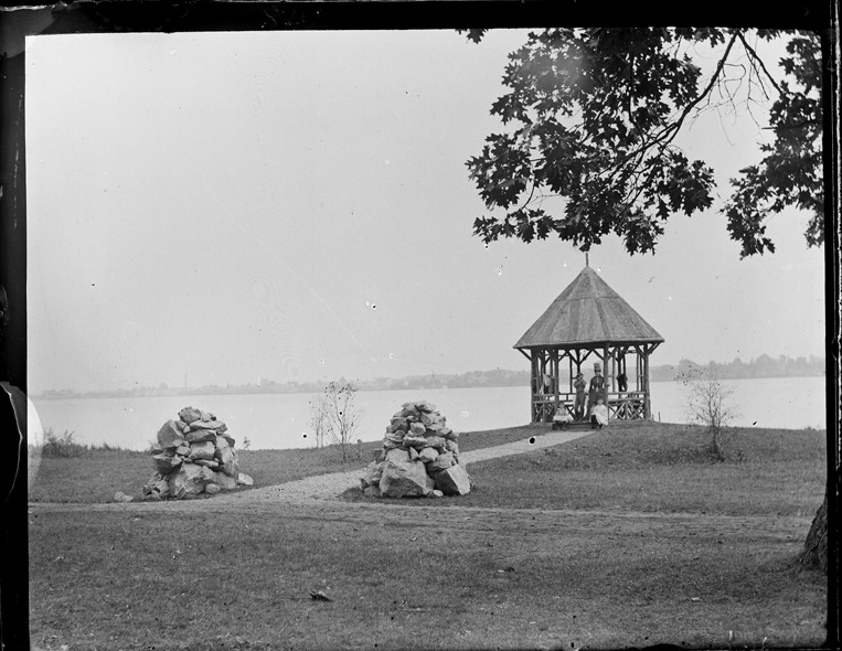 Woman and at least three children posed in rustic wooden gazebo on Belle Isle shore. Two stone cairns where path branches off from main path. Recorded in glass negative ledger: "D/Parks-Belle Isle-Buildings." Emulsion flaking and lifting at edges; some splotches.