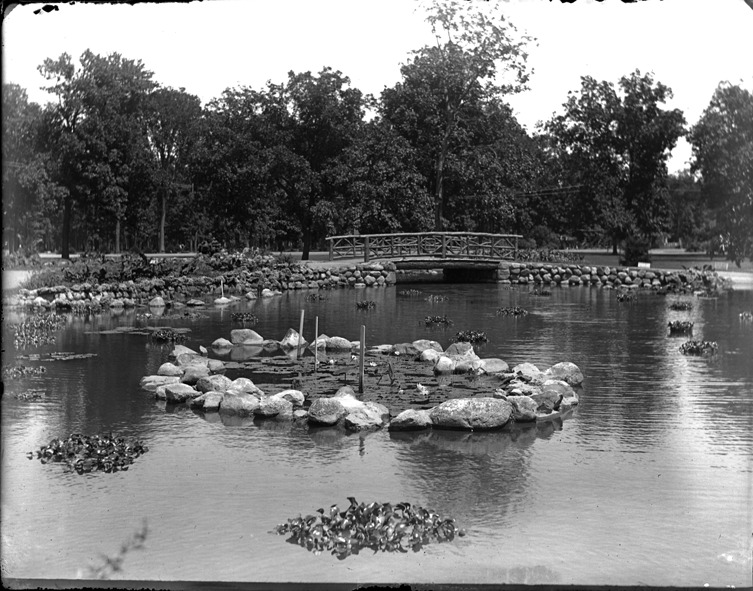 View across lily pond to rustic wooden bridge. Water lilies are concentrated inside a circle of stones in the center of frame. Other water plants in clumps scattered through pond. Trees and lawn beyond. Recorded in glass negative ledger: "D/Parks-Belle Isle-Canals." Emulsion flaking on edges and corners.