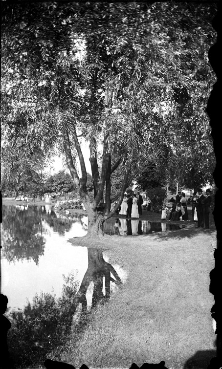 Favorite this☆ Group of people in park under large tree Description: View along shore in Waterworks Park. Water level is higher than usual, with grass visible under water. Groups of people under trees. Recorded in glass negative ledger: "D/Parks-Waterworks." Emulsion flaking at edges. Details Resource ID: EB02f676 Subject: Parks--Michigan--Detroit Ponds--Michigan--Detroit Glass negatives Date Issued: Unknown year Format: 1 negative : glass ; 5 x 3 in. Member of: Burton Historical Collection Negative Number: BHC glass neg. no. 3588 Rights: Physical rights are retained by DPL. Copyright is retained in accordance with U.S. copyright laws.