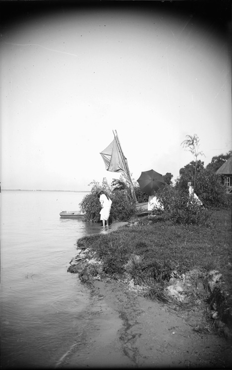 Three women with small sailboat nosed in to shore of Belle Isle on Detroit River. Two women on shore near bow, one blocked by parasol; one woman wading. Park building partially visible. Recorded in glass negative ledger: "D/Parks-Belle Isle." Minor scratches.