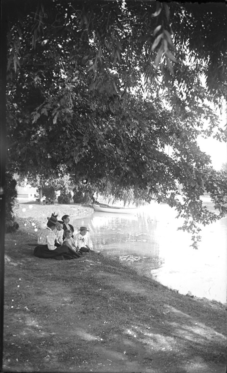 Two women and three children sitting under tree by water. Benches and buildings in background behind trees; rowing boat moored to tree. Written on image in reverse: "Aug. 1898." Recorded in glass negative ledger: "D/Parks-Belle Isle-Canals." Spots across image and emulsion damage near center.