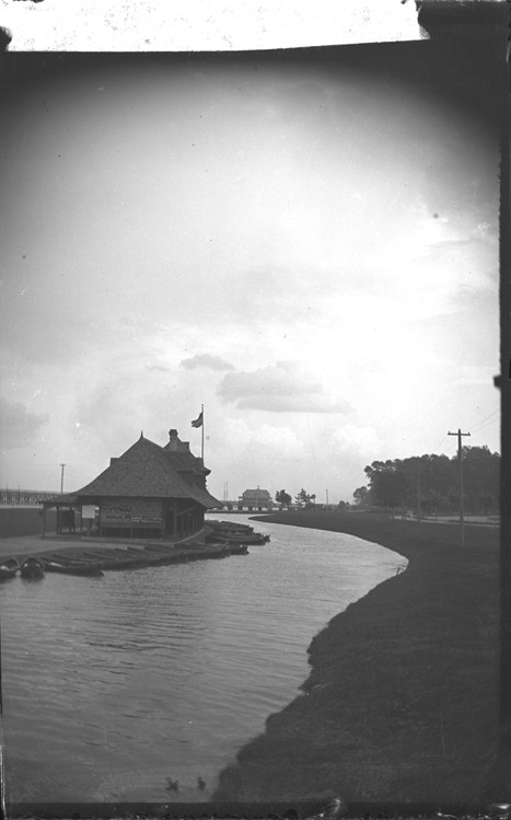 View along canal past boat rental building with rowing boats moored along seawall. Another large building in the distance along the Detroit River. Recorded in glass negative ledger: "D/Parks-Belle Isle-Buildings." Emulsion flaking at edges; large piece missing from top edge.