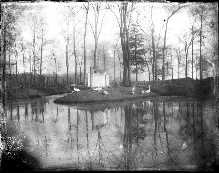 Swans on island. Log fence and small wooden shelter on island. Water looks frozen on surface; leafless trees and evergreens. Recorded in glass negative ledger: "D/Parks-Palmer." Emulsion lifting and flaking badly at edges; crack in lower right corner.